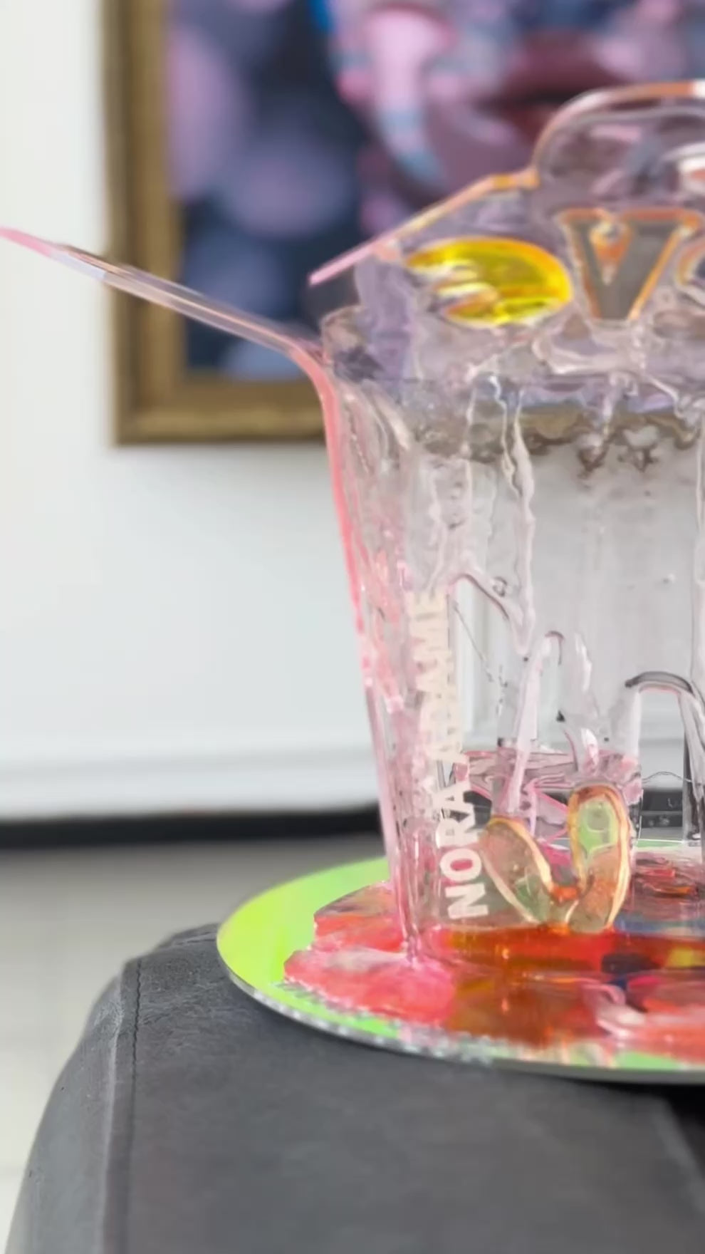 Caja china de acrílico transparente, intervenida con resina por la artista Nora Adame